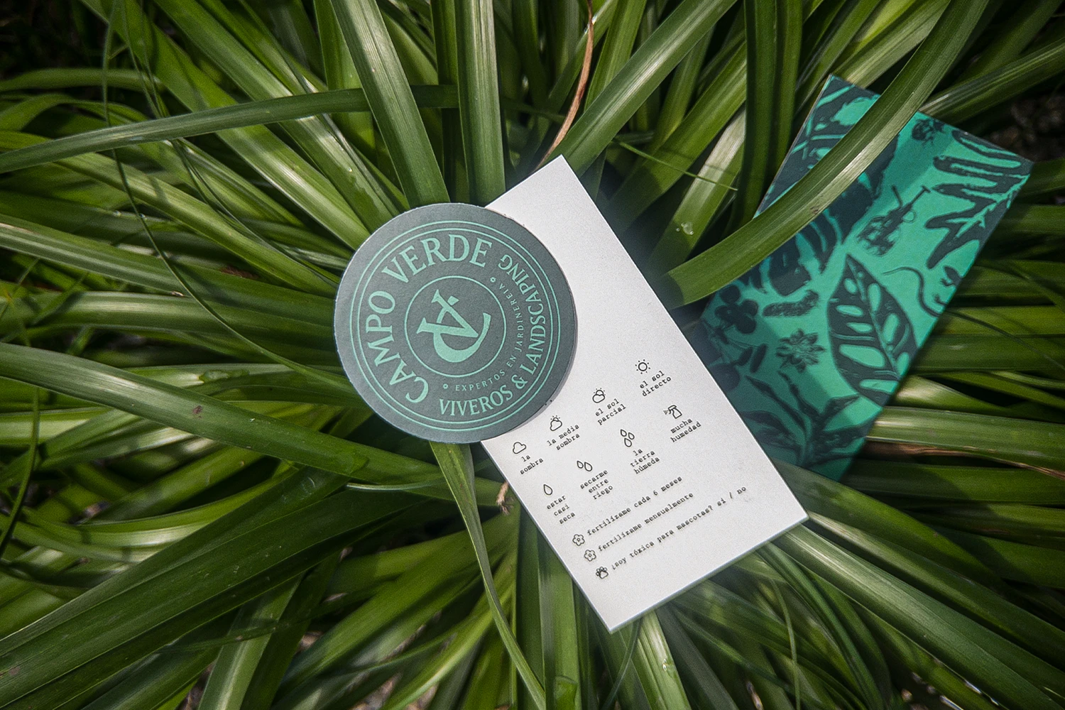 Solution: She mentioned that she likes that industrial look and since Campo Verde is the 'older sister' brand that has been active for so many years, we wanted this longevity to take part of the brand's image. We got our inspiration from industrial and old botanical designs found in gardens and museums. We used Matrix II as our main font to show off that old-school and stable feeling. We also kept the colors simple with a green monochromatic palette to highlight the brand's elements. We finished everything off with some monograms and showcased the rustic and handcrafted look with some handmade stamps to represent the nursery.