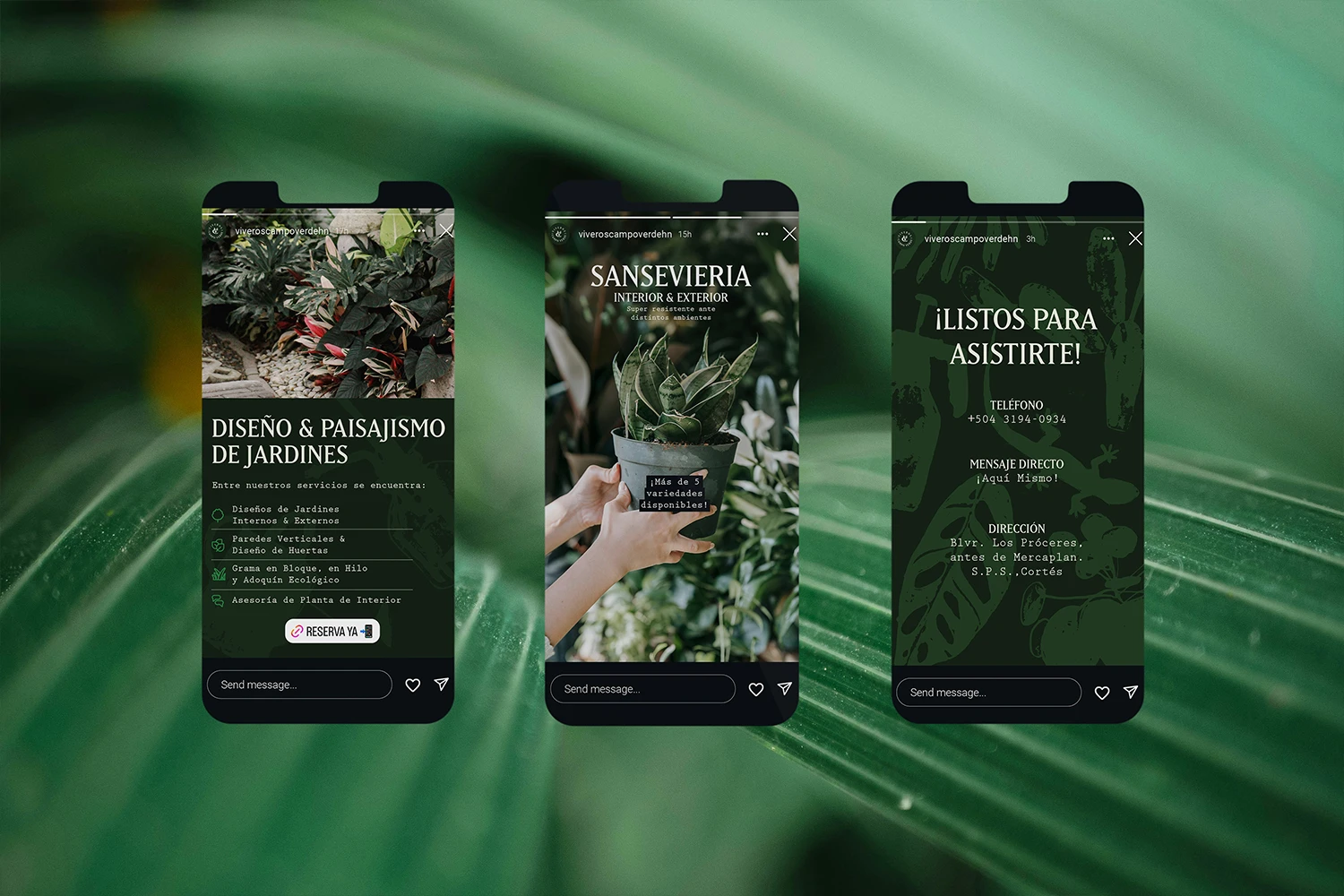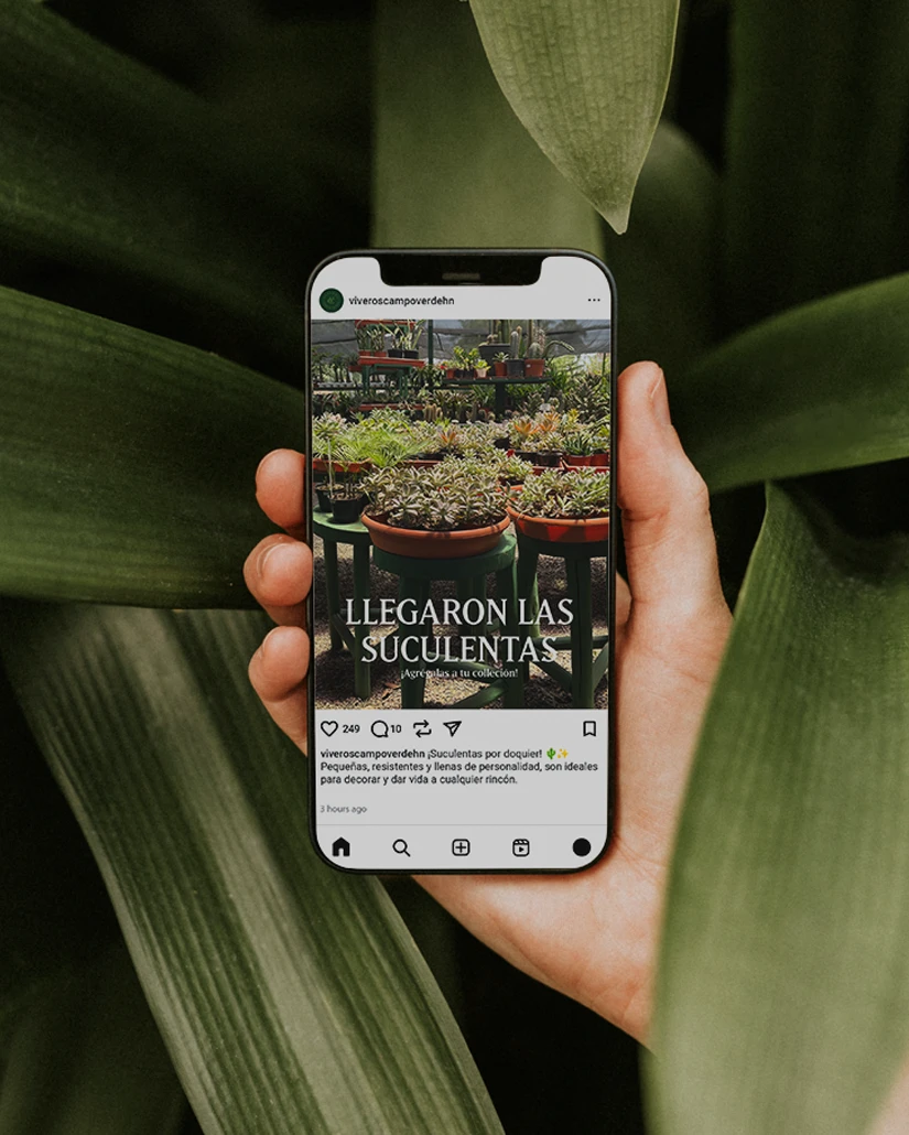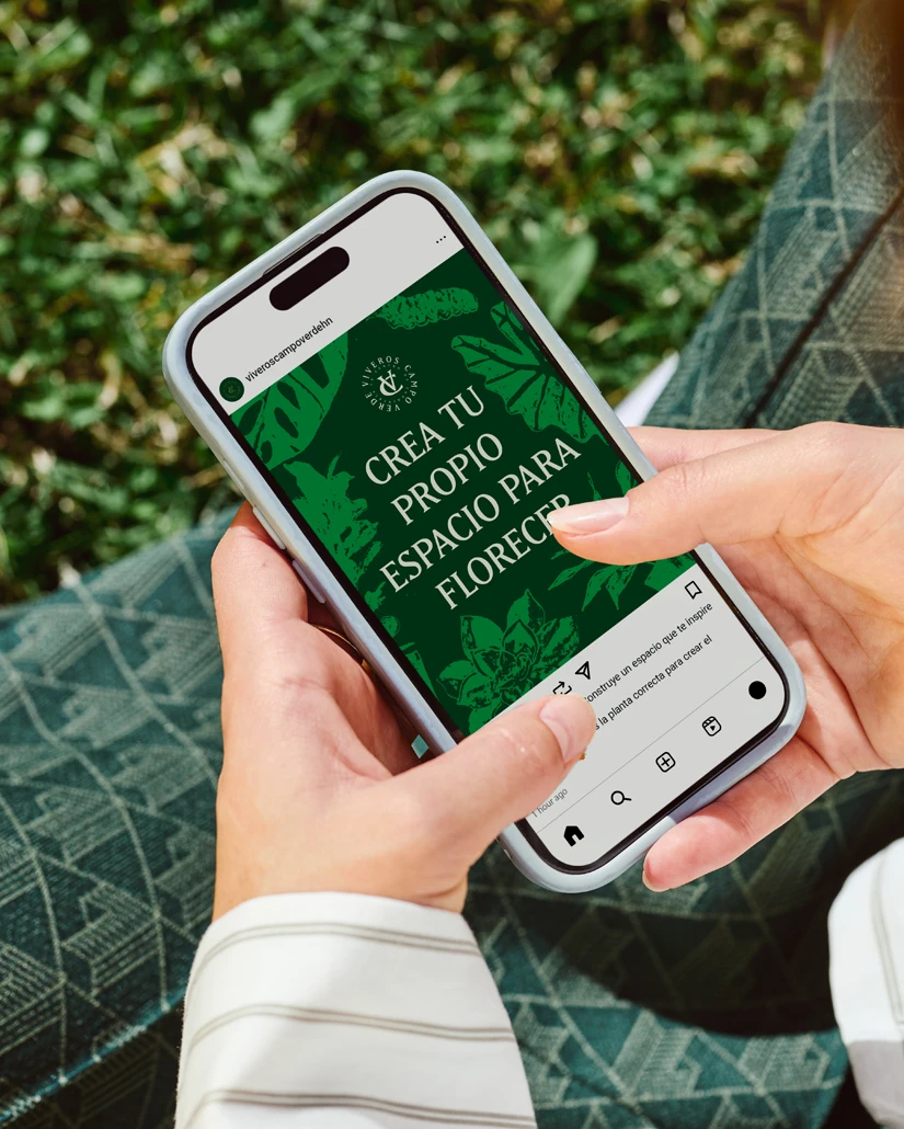 Challenge: Paola told us she wasn't happy with the logos she was using and wanted to be more active and organized on the nursery's social media. She also has two other brands that are derived from Viveros Campo Verde and she wanted them to be unified but with their individuality. She was looking for a refresh since the nursery keeps growing and she also has a lot of new ideas she would like to implement.